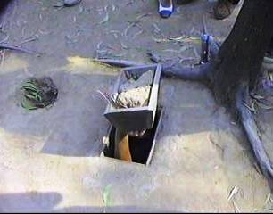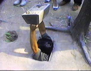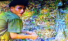 5 Meter Tiefe befanden, oben als Wippe gut getarnt, trat man darauf, war es der sichere Tod. Die Tarnung der Eingänge,zu den unterirdischen Anlagen waren so                                     gut, dass auch ein geübtes Auge  seine Schwierigkeiten damit hatte,sie zu entdecken. Ganz raffiniert waren die schmalen                                                 Blumenkastenfallen angelegt  -  in diesen unterirdischen Löchern, lauerte der Vietcong, von unten wurde dann