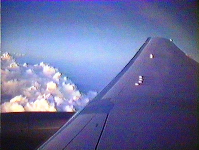 Hier überfliegen wir AfganhistanIn Arabien geht die Sonne auf,unser Flugzeug wird angestrahlt,links unten abfakeln der Ölfelder