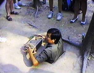 5 Meter Tiefe befanden, oben als Wippe gut getarnt, trat man darauf, war es der sichere Tod. Die Tarnung der Eingänge,zu den unterirdischen Anlagen waren so                                     gut, dass auch ein geübtes Auge  seine Schwierigkeiten damit hatte,sie zu entdecken. Ganz raffiniert waren die schmalen                                                 Blumenkastenfallen angelegt  -  in diesen unterirdischen Löchern, lauerte der Vietcong, von unten wurde dann